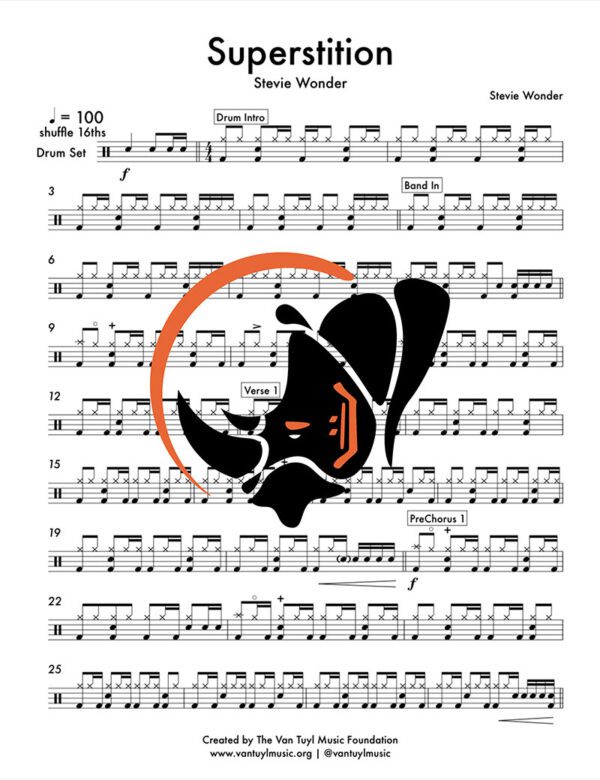The Van Tuyl Music Foundation’s drums set sheet music transcription of the drum set part played on Stevie Wonder’s song Superstition was completed by our team of elite, professional musicians who invest multiple hours into ensuring the accuracy of each transcription. PDF drum set sheet music downloads of our transcriptions are available for educational use only to members of The Van Tuyl Music Foundation’s Rhino Clubs, to students in programs funded by The Van Tuyl Music Foundation, and also to donors of The Van Tuyl Music Foundation who support our mission to make modern music education accessible to people of all ages, ethnicities, and economic backgrounds.